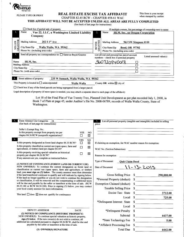 | 2 | 01/05/2015 | SWD | STATUTORY WARRANTY DEED | WALLA WALLA DEVELOPMENT LLC | VUE 22 LLC | | 7-PARCELS | | 127219 | 2015-00068 |