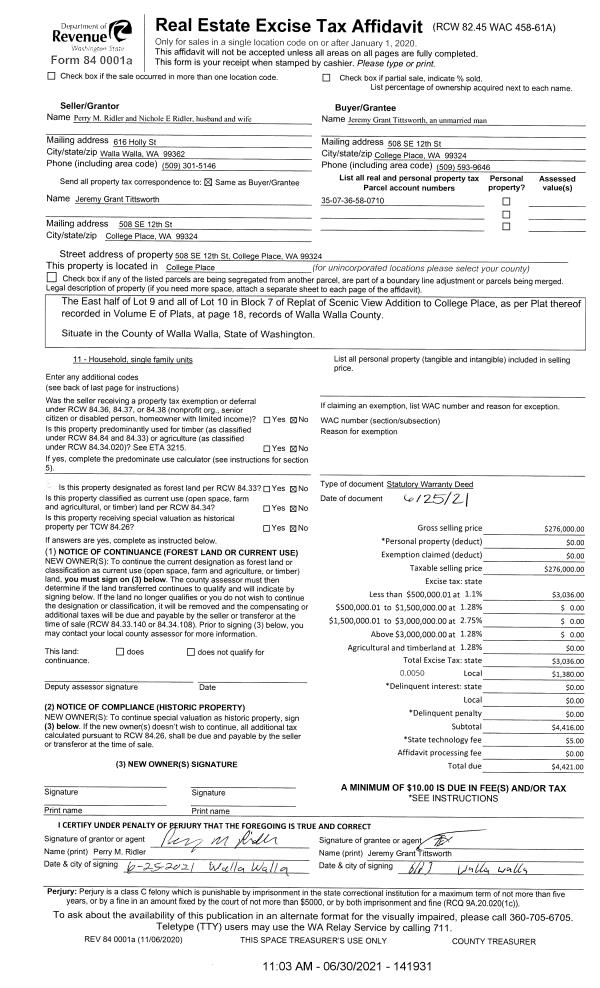 | 1 | 06/30/2021 | SWD | STATUTORY WARRANTY DEED | RIDLER PERRY M & NICHOLE E | TITTSWORTH JEREMY GRANT | | | $276,000.00 | 141931 | 2021-07934 |