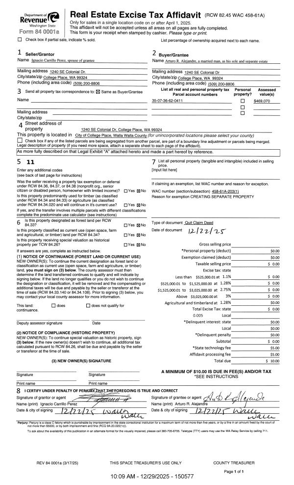 | 1 | 12/29/2025 | QCD | QUIT CLAIM DEED | | ALEJANDRE ARTURO R | | | | 150577 | 2025-07965 |