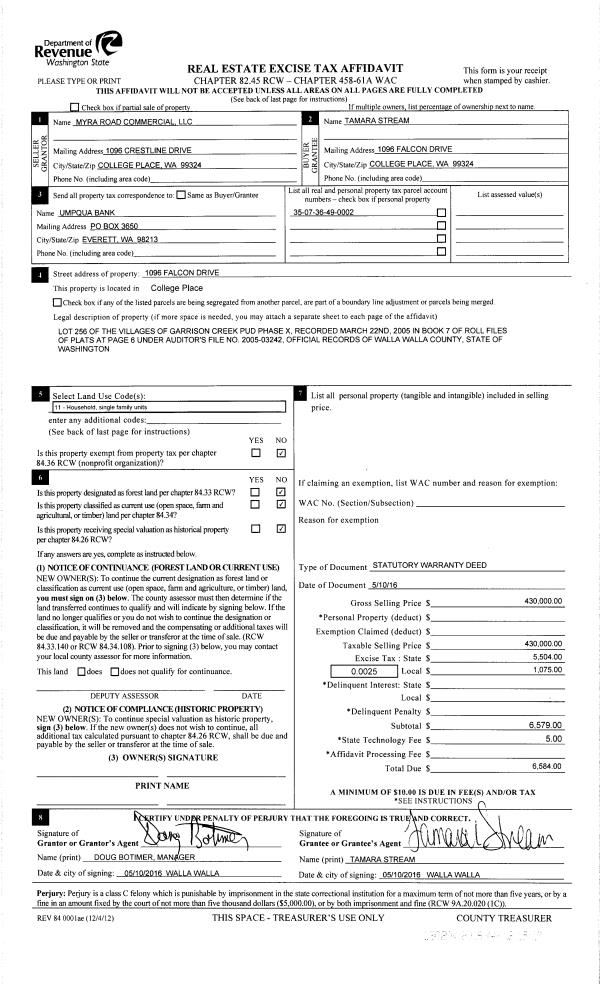 | 2 | 05/12/2016 | SWD | STATUTORY WARRANTY DEED | MYRA ROAD COMMERCIAL LLC | STREAM TAMARA L | | | $430,000.00 | 130204 | 2016-03554 |