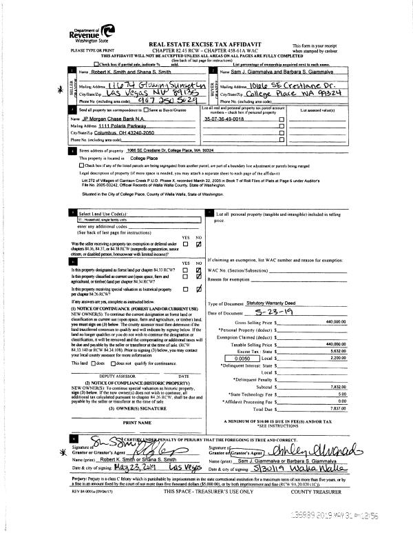 | 6 | 05/31/2019 | SWD | STATUTORY WARRANTY DEED | SMITH ROBERT K & SHANA S | GIAMMALVA SAM J & BARBARA S | | | $440,000.00 | 136989 | 2019-03728 |