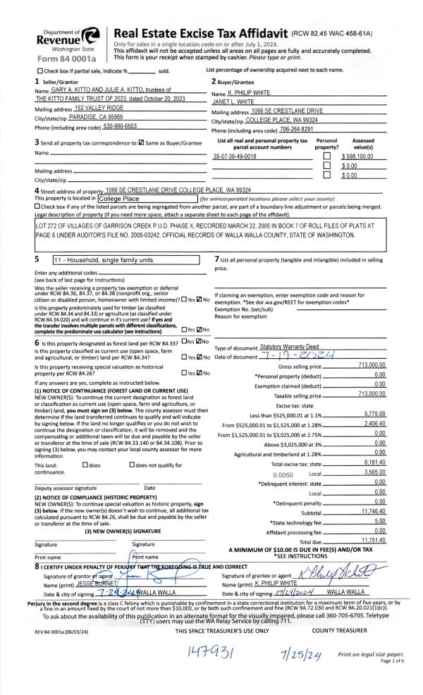 | 2 | 07/25/2024 | SWD | STATUTORY WARRANTY DEED | KITTO FAMILY TRUST | WHITE K PHILIP & JANET L | | | $713,000.00 | 147931 | 2024-04067 |