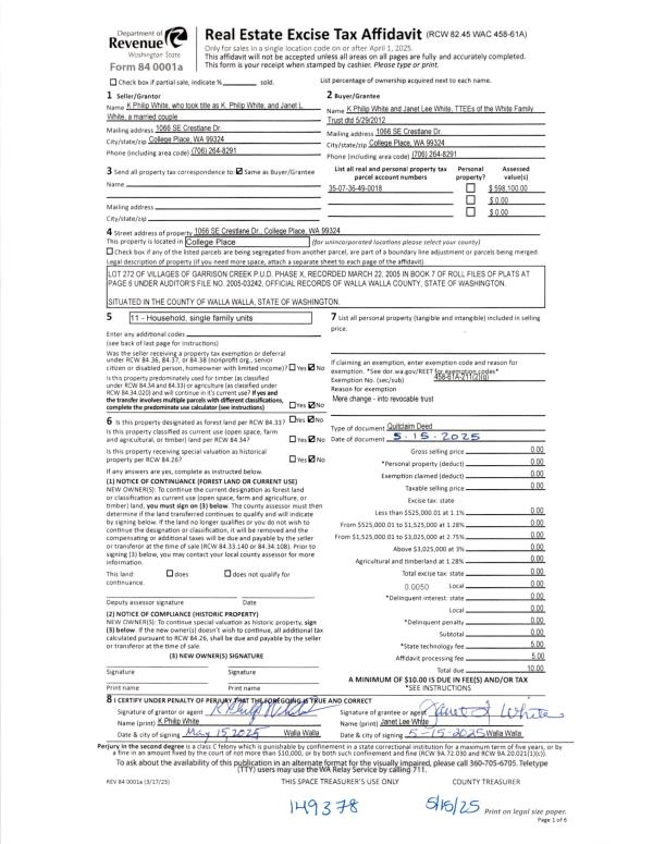 | 1 | 05/15/2025 | QCD | QUIT CLAIM DEED | WHITE K PHILIP & JANET L | WHITE FAMILY TRUST | | | | 149378 | 2025-02672 |