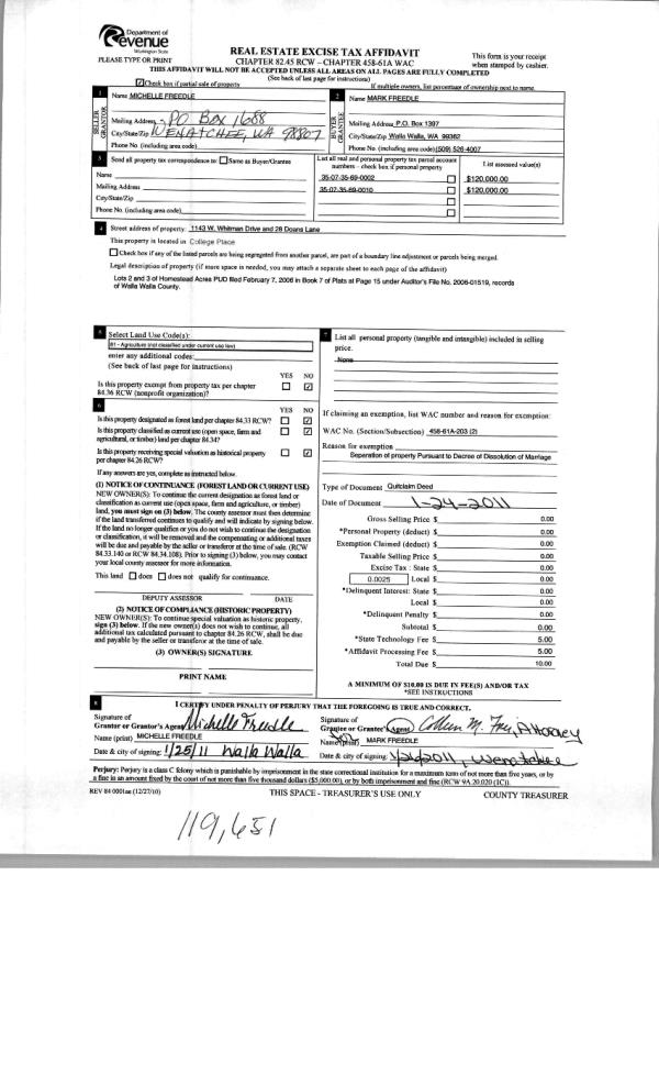 | 2 | 01/27/2011 | QCD | QUIT CLAIM DEED | FREEDLE, MICHELLE | FREEDLE, MARK | | | | 119651 | 2011-00831 |