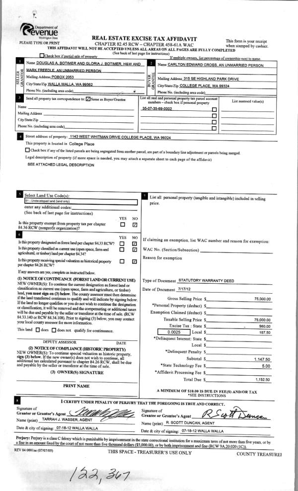| 1 | 07/19/2012 | WARRANTY D | WARRANTY DEED | BOTIMER, DOUGLAS A & GLORIA J | CROSS, CARLTON EDWARD | | | $75,000.00 | 122367 | 2012-06151 |
