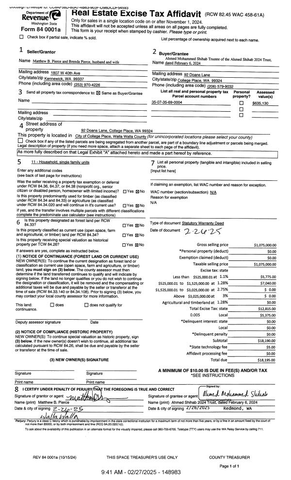| 1 | 02/27/2025 | SWD | STATUTORY WARRANTY DEED | PIERCE MATTHEW B & BRENDA | AHMED SHIHAB 2024 TRUST | | | $1,075,000.00 | 148983 | 2025-00994 |