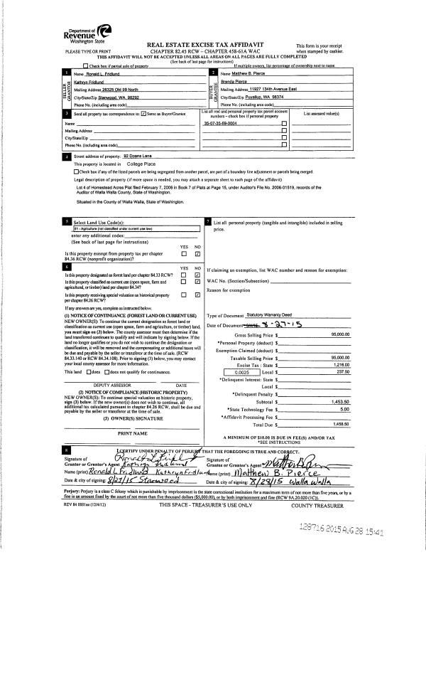 | 2 | 08/28/2015 | SWD | STATUTORY WARRANTY DEED | FRIDLUND RONALD L & KATHRYN | PIERCE MATTHEW B & BRENDA | | | $95,000.00 | 128716 | 2015-07588 |