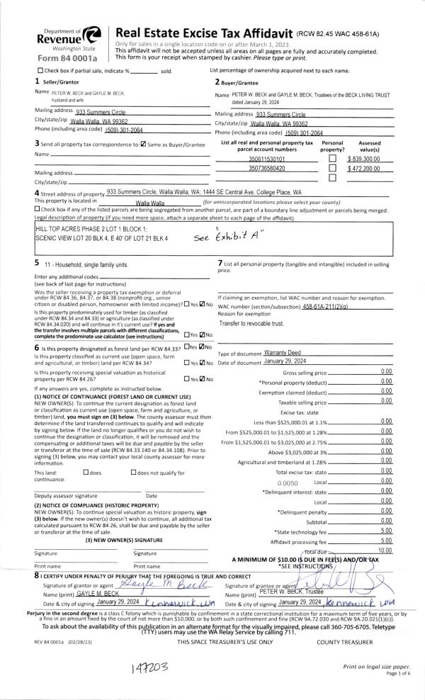 | 1 | 02/29/2024 | WARRANTY D | WARRANTY DEED | BECK PETER W & GAYLE M | BECK LIVING TRUST | | | | 147203 | 2024-01019 |