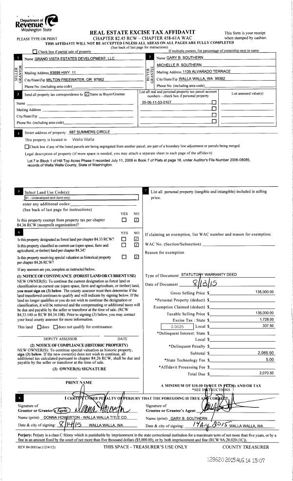 | 1 | 08/14/2015 | SWD | STATUTORY WARRANTY DEED | GRAND VISTA ESTATE DEV LLC | SOUTHERN GARY B & MICHELLE R | | | $135,000.00 | 128620 | 2015-07134 |