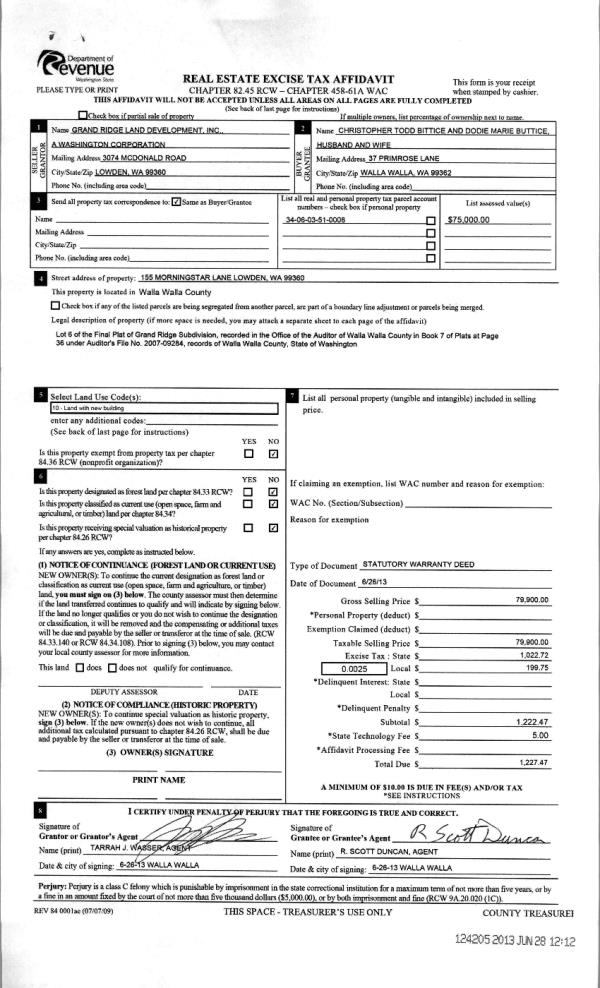 | 1 | 06/28/2013 | WARRANTY D | WARRANTY DEED | GRAND RIDGE LAND DEVELOPMENT I | BUTTICE, CHRISTOPHER & DODIE | | | $79,900.00 | 124205 | 2013-06519 |