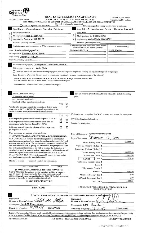 | 1 | 12/14/2018 | SWD | STATUTORY WARRANTY DEED | ZBARASCHUK KOREY L | HAMSHAR EDRIC A & EMMY L | | | $335,000.00 | 136095 | 2018-10332 |