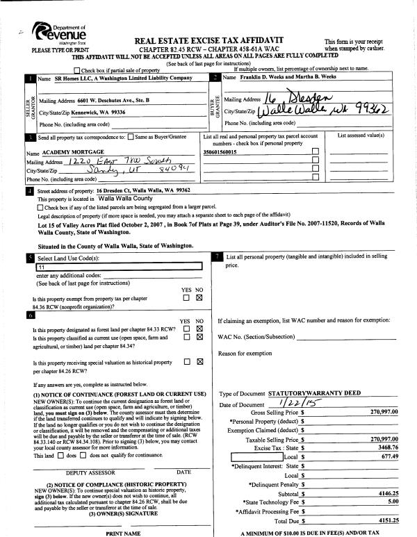 | 2 | 02/06/2015 | SWD | STATUTORY WARRANTY DEED | S R HOMES LLC | WEEKS FRANKLIN D & MARTHA B | | | $270,997.00 | 127406 | 2015-01255 |