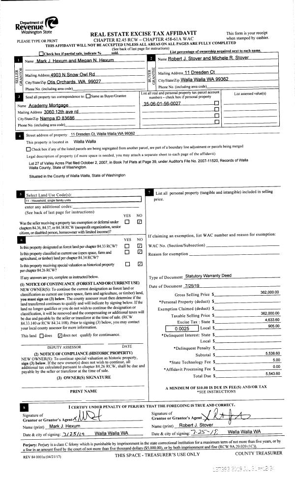 | 1 | 07/31/2019 | SWD | STATUTORY WARRANTY DEED | HEXUM MARK J & MEGAN N | STOVER ROBERT J & MICHELE R | | | $362,000.00 | 137393 | 2019-05626 |