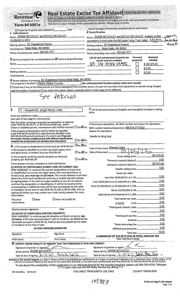| Mailing Address: | SHANE & NICOLE MCCAULEY TRUSTEES 43 CHAPELWOOD AVE WALLA WALLA, WA 99362 | % Ownership: | 100.0000000000% |