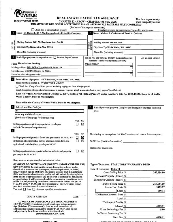 | 3 | 12/04/2014 | SWD | STATUTORY WARRANTY DEED | S R HOMES LLC | COCHRAN MICHAEL S & TERRI A | | | $267,654.00 | 127045 | 2014-08754 |
