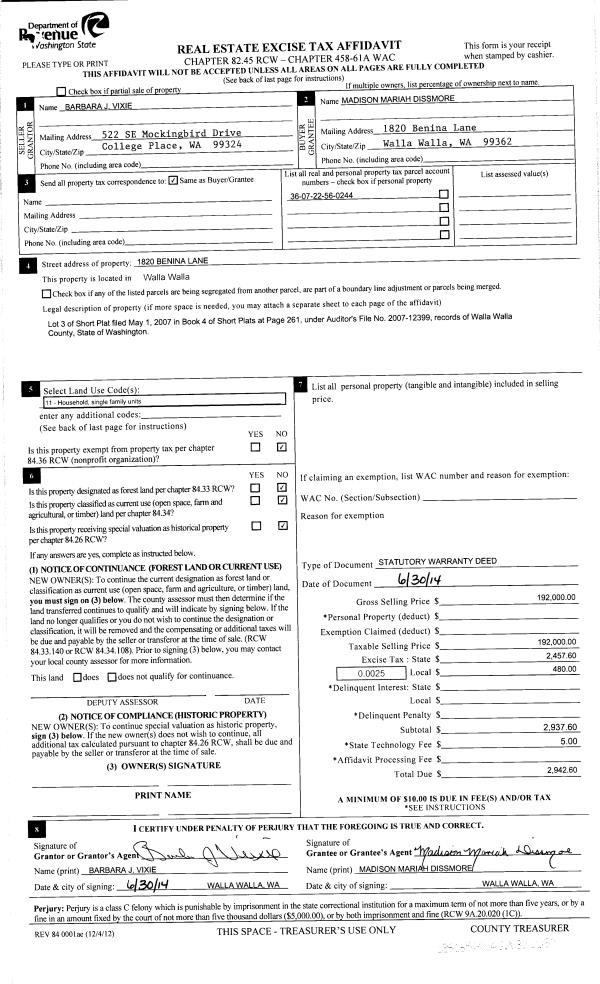 | 3 | 06/30/2014 | SWD | STATUTORY WARRANTY DEED | BELL BARBARA J | DISSMORE MADISON MARIAH | | | $192,000.00 | 126165 | 2014-04515 |
