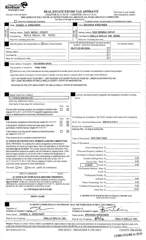 | 1 | 08/11/2016 | QCD | QUIT CLAIM DEED | KIRSHNER BRIANNA | KIRSHNER BRIANNA | | | $0.00 | 130840 | 2016-06551 |