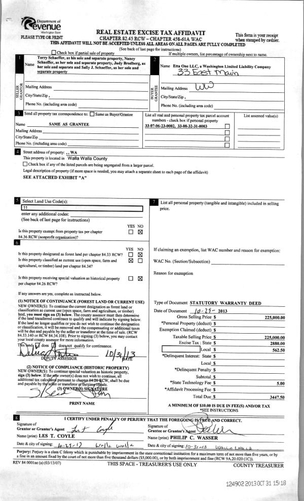 | 3 | 10/31/2013 | WARRANTY D | WARRANTY DEED | SCHAEFFER TERRY ETAL | ETTA ONE LLC | 2-PARCELS | | $225,000.00 | 124902 | 2013-10898 |