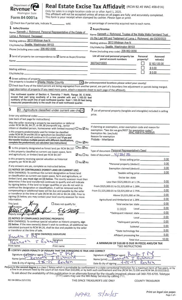 | 1 | 05/20/2025 | DPR | DEED OF PERSONAL REPRESENTATIVE | RICHMOND LORNA JEAN | WALLA WALLA FARMLAND TRUST | | | | 149412 | 2025-02781 |