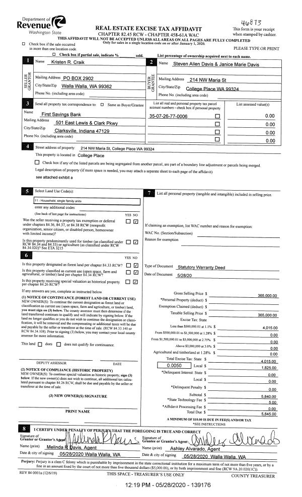 | 2 | 05/28/2020 | SWD | STATUTORY WARRANTY DEED | CRAIK KRISTEN R | DAVIS STEVEN ALLEN & JANICE MARIE | | | $365,000.00 | 139176 | 2020-04705 |
