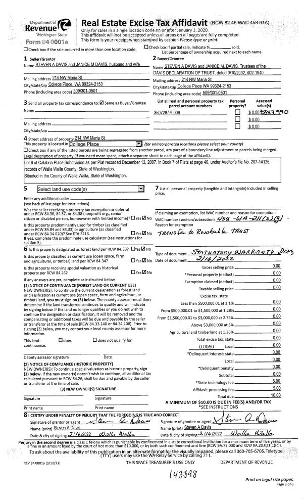 | 1 | 02/16/2022 | SWD | STATUTORY WARRANTY DEED | DAVIS STEVEN ALLEN & JANICE MARIE | DAVIS STEVEN ALLEN & JANICE MARIE DECLARATION OF TRUST | | | $0.00 | 143398 | 2022-01418 |