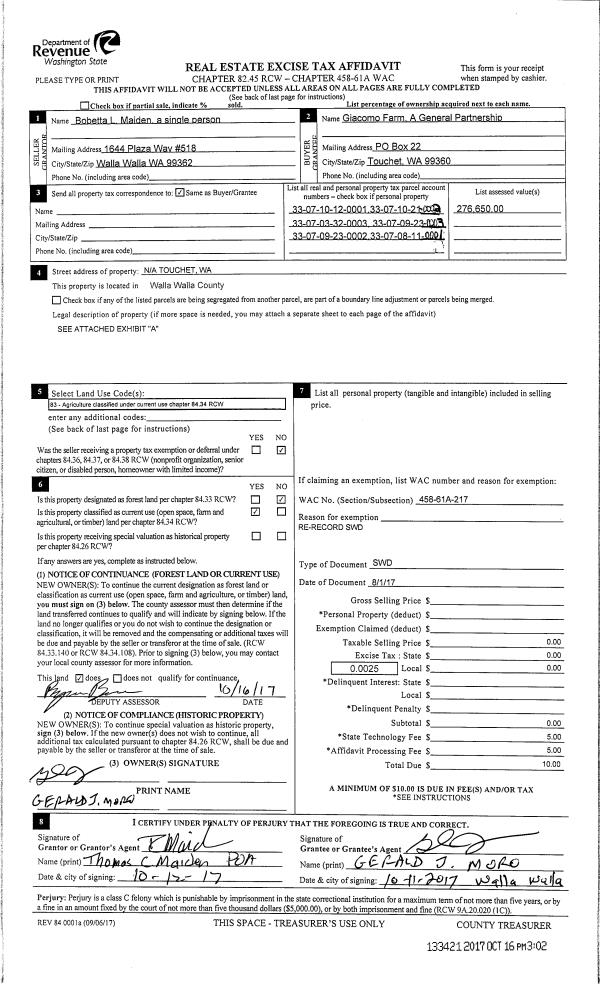 | 2 | 08/01/2017 | SWD | STATUTORY WARRANTY DEED | MAIDEN BOBETTA L ESTATE OF | GIACOMO FARM | | 6 PARCELS | $1,100,000.00 | 132907 | 2017-05916 |