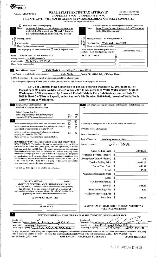 | 2 | 06/23/2015 | SWD | STATUTORY WARRANTY DEED | LOCATI AMBROSE J JR & | STONE CREEK CUSTOM HOMES LLC | | | $38,000.00 | 128226 | 2015-05248 |