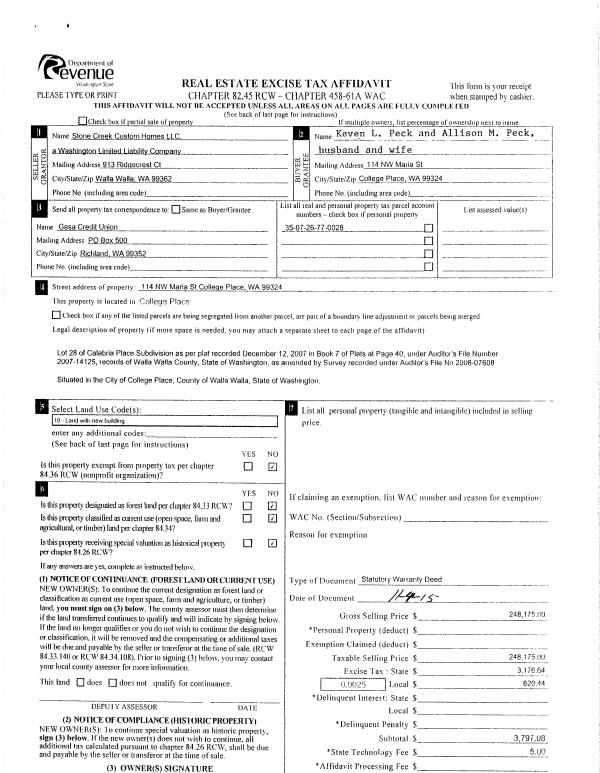 | 1 | 11/06/2015 | SWD | STATUTORY WARRANTY DEED | STONE CREEK CUSTOM HOMES LLC | PECK KEVEN L & ALLISON M | | | $248,175.00 | 129153 | 2015-09699 |