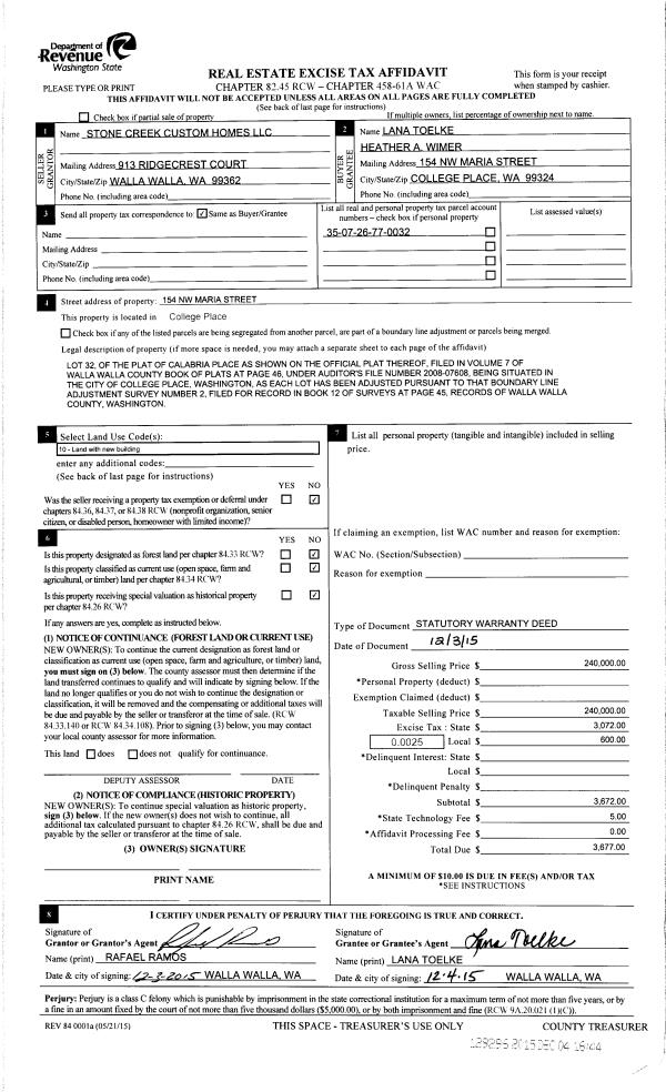 | 2 | 12/04/2015 | SWD | STATUTORY WARRANTY DEED | STONE CREEK CUSTOM HOMES LLC | TOELKE LANA | | | $240,000.00 | 129296 | 2015-10414 |