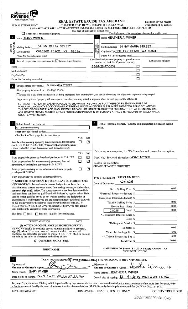 | Mailing Address: | HEATHER A WIMER 154 NW MARIA ST COLLEGE PLACE, WA 99324 | % Ownership: | 100.0000000000% |