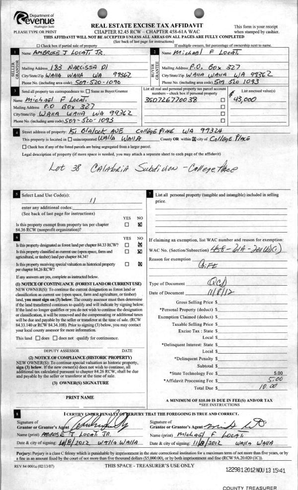| 4 | 11/13/2012 | QCD | QUIT CLAIM DEED | LOCATI, AMBROSE J JR | LOCATI, MICHAEL F | | | $0.00 | 122981 | 2012-10030 |