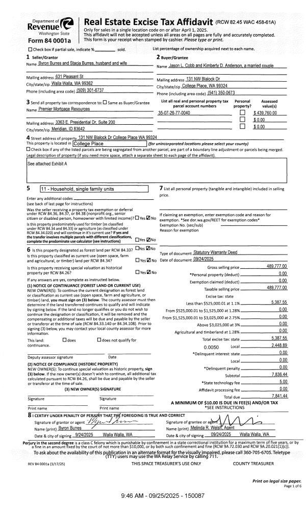 | 1 | 09/25/2025 | SWD | STATUTORY WARRANTY DEED | BURRES BYRON & STACIA | COBB JASON L & KIMBERLY D ANDERSON | | | $489,777.00 | 150087 | 2025-05822 |