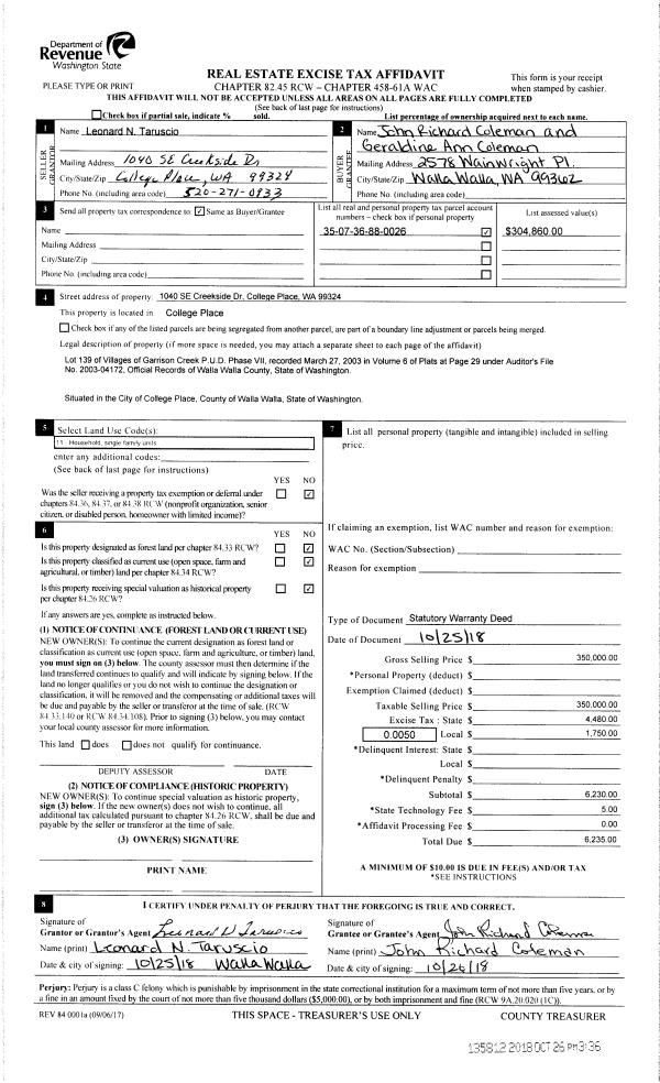 | 2 | 10/26/2018 | SWD | STATUTORY WARRANTY DEED | TARUSCIO LEONARD N | COLEMAN JOHN RICHARD & GERALDINE ANN | | | $350,000.00 | 135812 | 2018-08886 |