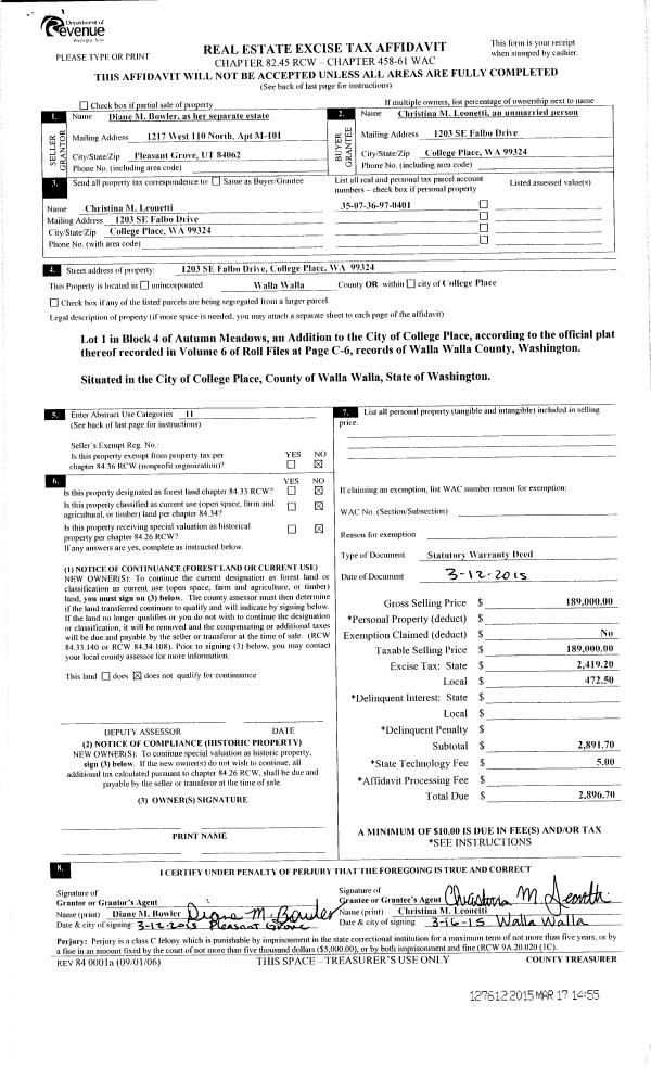| 4 | 03/17/2015 | SWD | STATUTORY WARRANTY DEED | BOWLER DIANE MARIE | LEONETTI CHRISTINA M | | | $189,000.00 | 127612 | 2015-02241 |