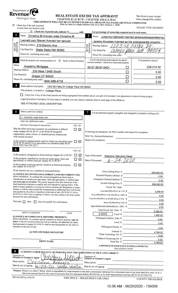 | Mailing Address: | JEREMY KNOWLES 1203 SE FALBO DR COLLEGE PLACE, WA 99324 | % Ownership: | 100.0000000000% |