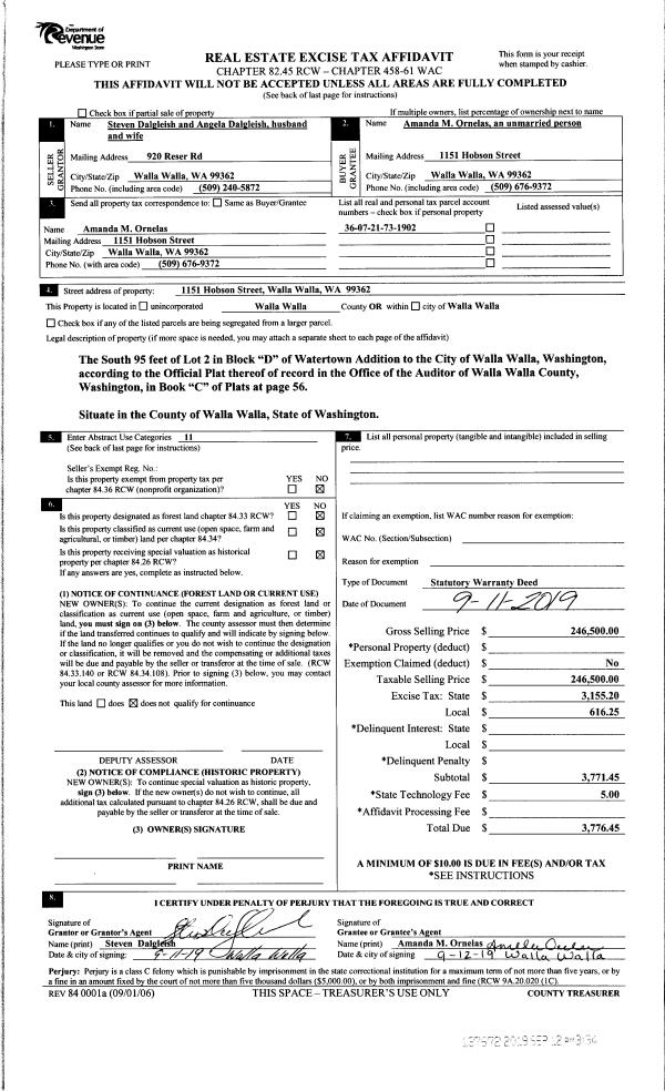 | 1 | 09/12/2019 | SWD | STATUTORY WARRANTY DEED | DALGLEISH STEVEN & ANGELA | ORNELAS AMANDA M | | | $246,500.00 | 137672 | 2019-07102 |