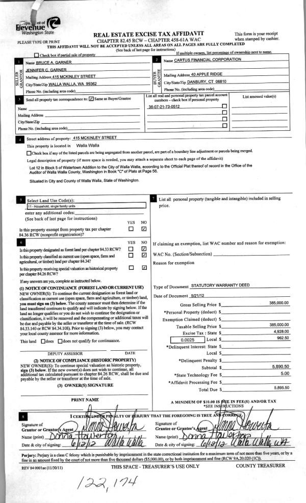 | 3 | 06/13/2012 | WARRANTY D | WARRANTY DEED | GARNER, BRUCE A & JENNIFER C | CARTUS FINANCIAL CORPORATION | | | $385,000.00 | 122174 | 2012-04875 |