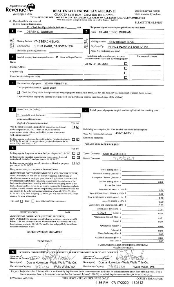 | 2 | 07/17/2020 | QCD | QUIT CLAIM DEED | DURHAM DEREK | DURHAM SHARLEEN C | | | | 139512 | 2020-06891 |