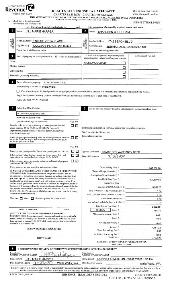 | 3 | 07/17/2020 | SWD | STATUTORY WARRANTY DEED | HUGHES JILL M | DURHAM SHARLEEN C | | | $307,500.00 | 139511 | 2020-06890 |