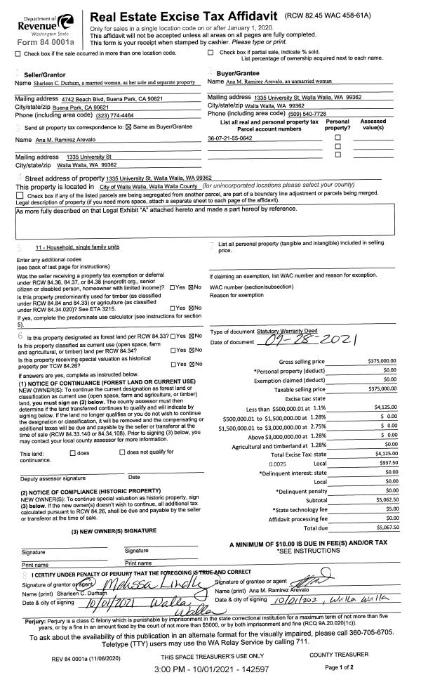 | 1 | 10/01/2021 | SWD | STATUTORY WARRANTY DEED | DURHAM SHARLEEN C | AREVALO ANA M RAMIREZ | | | $375,000.00 | 142597 | 2021-12057 |
