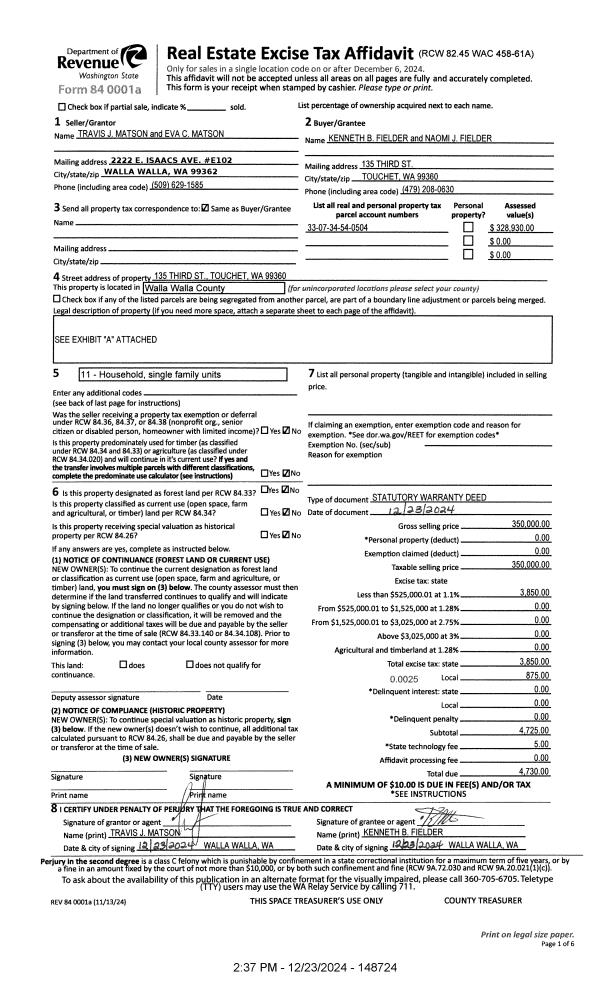 | 1 | 12/23/2024 | SWD | STATUTORY WARRANTY DEED | MATSON TRAVIS J & EVA C | FIELDER KENNETH B & NAOMI J | | | $350,000.00 | 148724 | 2024-07399 |