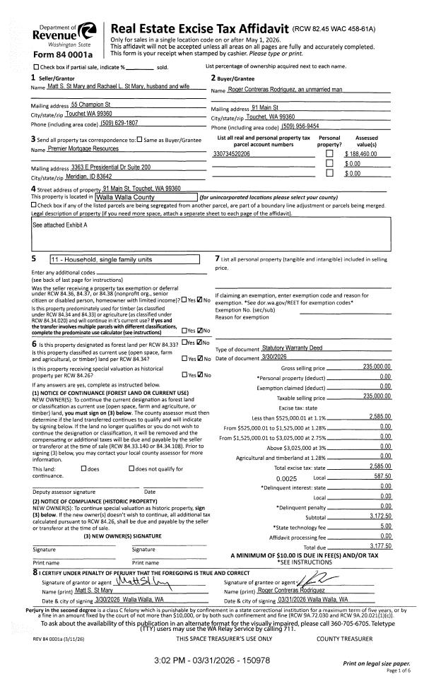 | Mailing Address: | 91 MAIN ST TOUCHET, WA 99360 | % Ownership: | 100.0000000000% |