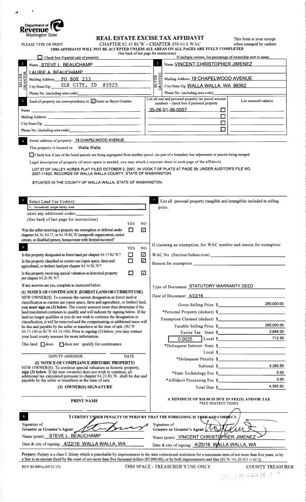 | 3 | 04/28/2016 | SWD | STATUTORY WARRANTY DEED | BEAUCHAMP STEVE L & LAURIE A | JIMENEZ VINCENT CHRISTOPHER | | | $285,000.00 | 130118 | 2016-03170 |