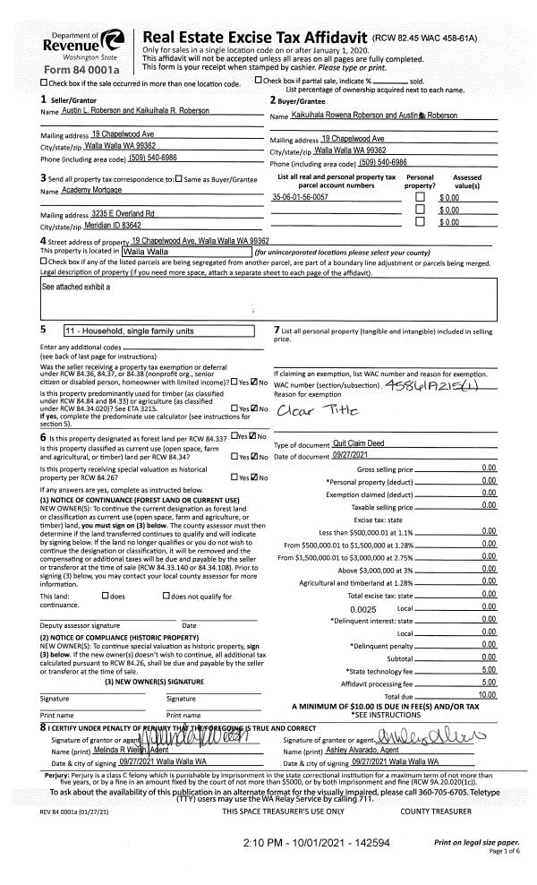 | 1 | 10/01/2021 | QCD | QUIT CLAIM DEED | ROBERSON AUSTIN L & KAIKUIHALA R | ROBERSON KAIKUIHALA ROWENA & AUSTIN | | | $0.00 | 142594 | 2021-12052 |