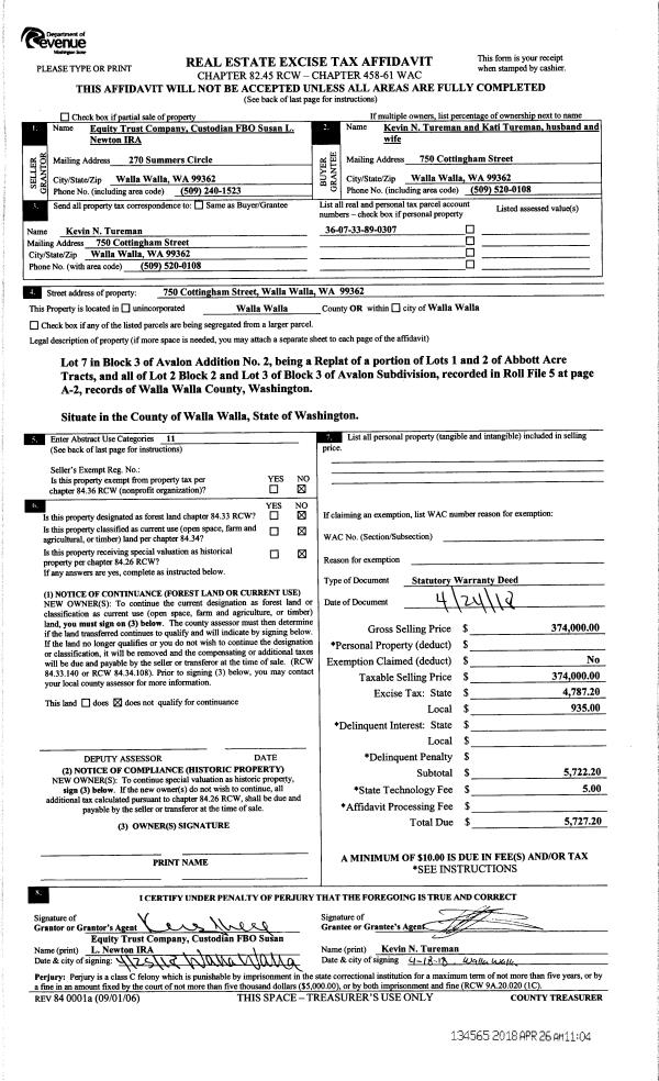 | 1 | 04/26/2018 | SWD | STATUTORY WARRANTY DEED | EQUITY TRUST COMPANY CUSTODIAN FBO | TUREMAN KEVIN N & KATI | | | $374,000.00 | 134565 | 2018-03260 |