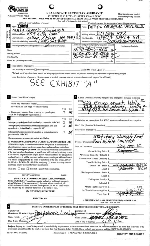 | 7 | 05/09/2014 | REAL ESTAT | REAL ESTATE CONTRACT | LINEBAUGH PAUL & SHERRIE | VASQUEZ RAFAEL ORNELAS II | | 3-PARCELS | $324,000.00 | 125855 | 2014-03176 |