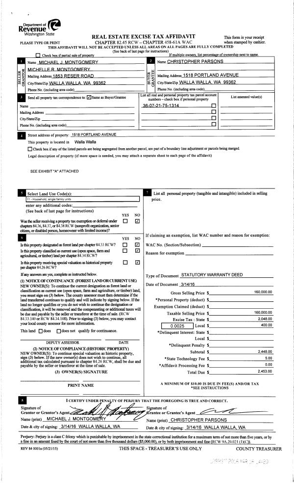 | 1 | 03/16/2016 | SWD | STATUTORY WARRANTY DEED | MONTGOMERY MICHAEL & MICHELLE | PARSONS CHRISTOPHER | | | $160,000.00 | 129837 | 2016-01978 |