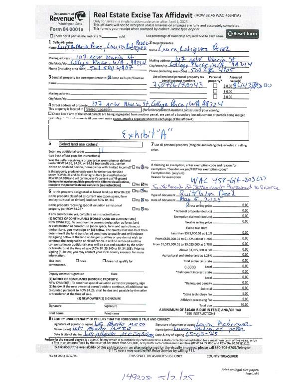 | 1 | 05/05/2025 | QCD | QUIT CLAIM DEED | PEREZ LOUIS A MEZA & LAURA RODRIGUEZ | PEREZ LAURA RODRIGUEZ | | | | 149338 | 2025-02451 |