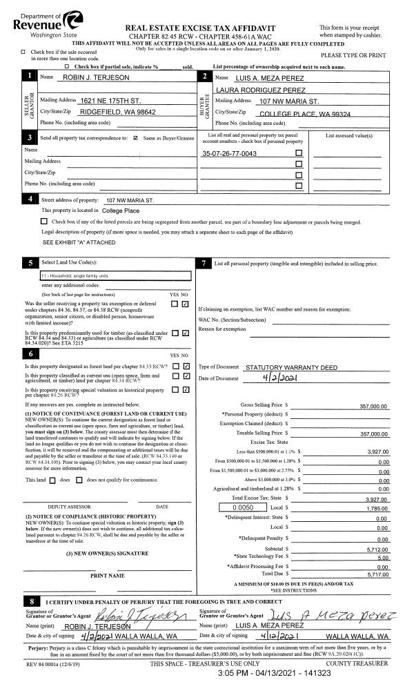 | 2 | 04/13/2021 | SWD | STATUTORY WARRANTY DEED | TERJESON ROBIN J | PEREZ LOUIS A MEZA & LAURA RODRIGUEZ | | | $357,000.00 | 141323 | 2021-04352 |