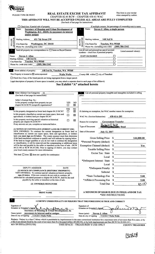 | 1 | 07/24/2017 | BARGAIN & | BARGAIN & SALE DEED | SECRETARY OF HOUSING & URBAN DEVELOPMENT | ALLEN STEVEN J | | | $144,000.00 | 132828 | 2017-05623 |